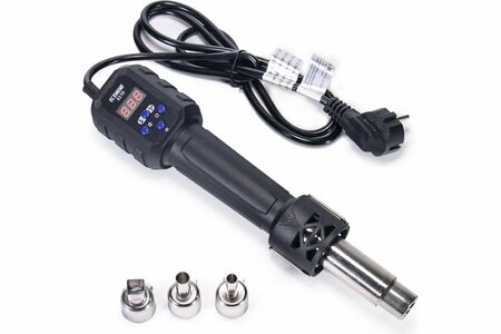 Устройство применяется для операций распайки и пайки широкого спектра компонентов, например: 5ОГС, СНГ, @ЕР, ресс, ВСА, 5МО и другие. Подходит для распайки линейных розеток. Можно использовать для термоусадки, сушки, удаления краски, удаления клея, размораживания, предварительного нагрева и многого другого. Напряжение: 220 В. Наконечник в комлпекте: да. Длина фена: 280 мм. Потребляемая мощность: 700 Вт. Min температура: 100 °С. Max температура: 500 °С. Длина шнура: 1.3 м. Производительность: 100 л/мин. Вес нетто: 0.378 кг. Комплектация: Паяльный фен, Сопло - 3 шт, Инструкция.
