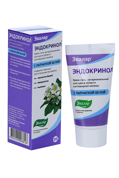Ингредиенты, входящие в состав крем-геля Эндокринол, способствуют нормализации обменных процессов, повышению тургора и эластичности кожи. Свойства компонентов состава. Лапчатка белая. Полезные свойства определяются её уникальным химическим составом, относительно изученным в настоящее вемя. Все части растения содержат гликозиды, сапонины, фенолкарбоновые кислоты, флавоноиды, аминокислоты и являются концентратом микро- и макроэлементов. Высокая сосудистая и клеточная проницаемость биологически активных веществ лапчатки белой объясняется взаимодействием этих веществ с белками клеточных мембран и сосудисто-тканых барьеров. Совсем недавно российскими учёными это растение предложено в качестве средства, способствующего нормализации функций щитовидной железы. Звездчатка средняя. Используется надземная часть растения, содержащая витамин Е, аскорбиновую кислоту, каротин, дубильные вещества. В народной медицине растение используют при заболеваниях щитовидной железы внутрь (салаты, настой) и наружно (компрессы). Компрессы предназначены для размягчения (разжижения) экссудата фолликулов щитовидной железы, для рассасывания узелковых образований, для ликвидации лимфатического застоя. Льнянка обыкновенная. Используются цветущие верхушки травы, содержащие алкалоиды, флавоновые гликозиды, сапонины, органические кислоты. В официальной медицине используют "жабрейную мазь" при кожных заболеваниях, как противоопухолевое, болеутоляющее, противовоспалительное средство. Народные целители на основании своего большого опыта подтверждают, что нанесение мази льнянки в области щитовидной железы рассасывает узлы. Пальмовое масло. Масло из плодов масляничной пальмы; отличается высокой концентрацией провитамина А (каротиноидов) и витамина Е (токоферолов и токотриенолов), которые обеспечивают антиоксидантные свойства. Активизирует липидный обмен в коже. Масляный экстракт GALLERIA. Мощный иммуномодулятор, содержит свободные аминокислоты и жирные кислоты, способствует снижению отёчности, уменьшению боли и напряжения мышц. Прекрасный проводник активных веществ через кожный барьер. Натуральные эфирные масла (грейпфруктовое, каюптовое, гераниевое, бергамотовое, мускатного шалфея) обладают противовоспалительным, противоотёчным, иммуномоделирующим действием, регулируют гормональный статус. В комплексе с масляным экстрактом Galleria служат транспортным средством для биологически активных веществ. Показания: Эндокринол - наружное средство специального назначения, предназначенное для кожи в области шеи. Регулярное применение крем-геля Эндокринол контролирует изменения тканей в области шеи (в том числе щитовидной железы). Способ применения и дозы: Крем наносить 1-2 раза в день на кожу в области шеи и декольте и втирать легкими массажными движениями до полного впитывания. Условия хранения: Хранить в сухом, прохладном месте.