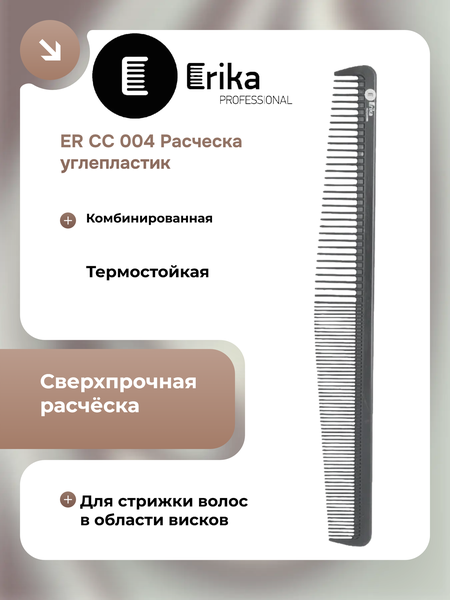 ER CC 004 Расческа углепластик Сверхпрочная расчёска Термостойкая V-образной формы Для стрижки волос в области висков Комбинированная Erika Professional представляет сверхпрочные парикмахерские расчёски изинновационного материала. Особая молекулярная структура композитного пластика с добавлением карбона и высококачественного нейлона обеспечивает изделиям невероятную термостойкость (230 °С) и прочность при сохранении эластичности.
