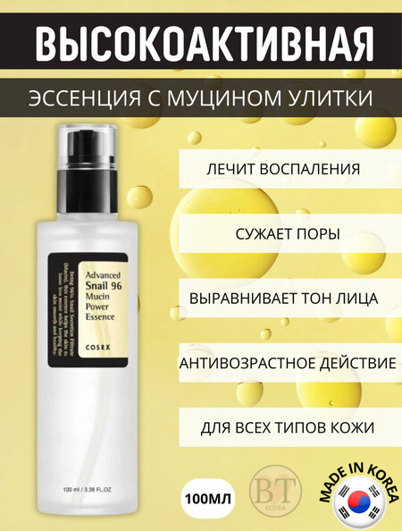 COSRX Advanced Snail 96 Mucin Power Essence – высокоактивная эссенция для восстановления кожи лица из Южной Кореи, ставшая культовым продуктом в азиатском уходе за кожей. Её уникальность заключается в очень высокой концентрации основного компонента, обеспечивающего многофункциональный уход. Особенности и преимущества Многофункциональный уход: Эссенция предназначена для интенсивного увлажнения, регенерации, борьбы с постакне (пятнами), улучшения общего тонуса и структуры кожи. Лёгкая текстура: Обладает лёгкой, слегка липкой (за счёт муцина), но нежирной консистенцией, которая не оставляет следов на лице и не утяжеляет кожу, быстро впитывается. Гипоаллергенно: Формула разработана с минимальным количеством ингредиентов (всего 10), что снижает риск воспалений. Подходит для чувствительной и реактивной кожи. Этичное производство: По данным COSRX, слизь улитки для этой эссенции собирается этично, без причинения вреда животным. Основные активные ингредиенты Концентрация ингредиентов: Фильтрат секрета слизи (Mucini) 96,3% Обладает выраженными регенерирующими и заживляющими свойствами. Ускоряет обновление клеток, уменьшает рубцы и пятна постакне, повышает эластичность. Интенсивно увлажняет. Гиалуроновая кислота (гиалуронат натрия) Связывает воду в эпидермисе, обеспечивает глубокое и длительное увлажнение, предотвращает сухость. Пантенол Смягчает, успокаивает кожу, устраняет покраснения и раздражения, способствует заживлению микроповреждений. Аргинин Аминокислота, стимулирующая микроциркуляцию, ускоряющая процессы восстановления и борющаяся с пигментацией. Аллантоин Увлажняет, смягчает, оказывает противовоспалительное действие и ускоряет регенерацию. Инструкция по применению (Кому подходит) Обезвоженная и сухая кожа, нуждающаяся в увлажнении. Признаки усталости и тусклая кожа. Проблемная кожа, склонная к акне и воспалениям. Пятна постакне, шрамы и неровный тон кожи. Чувствительная кожа, требующая успокаивающего ухода. Способ применения Нанесите эссенцию на очищенную и тонизированную кожу. Выдавите небольшое количество эссенции (1-2 нажатия) и распределите по лицу легкими массажными или похлопывающими движениями. Используйте утром и вечером перед нанесением сыворотки и/или увлажняющего крема.