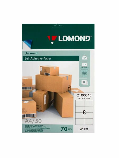 Самоклеящиеся этикетки — универсальное средство для маркировки, учета и организации повседневной работы в офисе, на складе и дома. Они отличаются простотой применения: снимаете защитную подкладку и наклеиваете на любые поверхности — бумаги, картон, пластик, стекло и металл — без дополнительных инструментов. Этикетки бывают различной формы и размера что позволяет точно подбирать под нужды проекта или учета: от компактных круглых и квадратных до длинных лент для маркировки коробок и витрин. Стойкость к стиранию и воздействию влаги обеспечивает сохранность информации даже в складских условиях, а яркие цвета и контрастные шрифты улучшают читаемость на расстоянии. Существуют различные виды материалов: матовые поверхности подходят для обычной печати ручкой или лазерного принтера, глянцевые обеспечивают более насыщенный внешний вид, а полупрозрачные этикетки позволяют маркировать поверхности, сохраняя видимую подложку. Этикетки применяются для инвентаризации, идентификации товаров, упаковки, учёта материалов, этикетирования мероприятий и любой задачи, где важна ясная и быстрая коммуникация информации. Этикетки самоклеящиеся, 105*74,3 мм, 8 шт. на листе, 70 г/кв. м, А4, 50 листов, цвет белый, Lomond, 2100045. Торговая марка: Lomond; Страна: россия; Упаковка: 27.