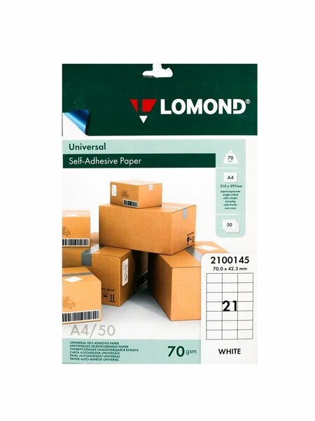 Самоклеящиеся этикетки — универсальное средство для маркировки, учета и организации повседневной работы в офисе, на складе и дома. Они отличаются простотой применения: снимаете защитную подкладку и наклеиваете на любые поверхности — бумаги, картон, пластик, стекло и металл — без дополнительных инструментов. Этикетки бывают различной формы и размера что позволяет точно подбирать под нужды проекта или учета: от компактных круглых и квадратных до длинных лент для маркировки коробок и витрин. Стойкость к стиранию и воздействию влаги обеспечивает сохранность информации даже в складских условиях, а яркие цвета и контрастные шрифты улучшают читаемость на расстоянии. Существуют различные виды материалов: матовые поверхности подходят для обычной печати ручкой или лазерного принтера, глянцевые обеспечивают более насыщенный внешний вид, а полупрозрачные этикетки позволяют маркировать поверхности, сохраняя видимую подложку. Этикетки применяются для инвентаризации, идентификации товаров, упаковки, учёта материалов, этикетирования мероприятий и любой задачи, где важна ясная и быстрая коммуникация информации. Этикетки самоклеящиеся, 70*42,3 мм, 21 шт. на листе, 70 г/кв. м, А4, 50 листов, цвет белый, Lomond, 2100145. Торговая марка: Lomond; Страна: россия; Упаковка: 27.