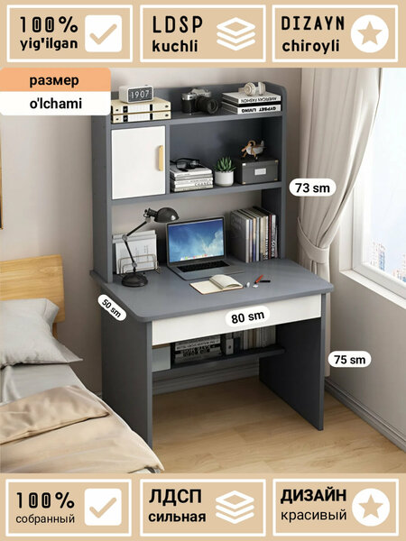 Неповторимый Дизайн (Dizayn chiroyli / Дизайн красивый): Минималистичный и элегантный дизайн стола EVRIKA идеально впишется в любой интерьер вашего дома. Доступны три варианта цвета: яркий и воздушный "Белый", стильный и современный "Серый" и натуральный и теплый "Деревянный". Продуманная система полок в верхней части стола создает удобство для хранения книг, офисных принадлежностей и декоративных элементов.