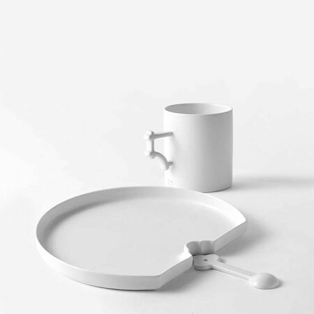Набор посуды Fan, в комплект входят кружка, ложка и тарелка. Изделия изготовлены из фарфора с матовым покрытием. Лаконичный дизайн, интерпретирующий форму традиционных корейского веера палдоксона и решёток дверей, порадует ценителей оригинальных и стильных вещей. Изделия подходят для мытья в посудомоечной машине и использования в микроволновой печи. Произведено вручную в Корее. Материалы: Фарфор Размер: Тарелка — 18 x 21 x H18 см Ложка — 3,3 x 10 x 0,5 см Кружка — Ø 7,7 x H8,5 см