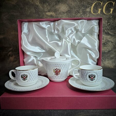 Фарфоровый набор из 2-х чайных пар синяя сетка 250 мл и Чайника 450мл "Герб РФ"