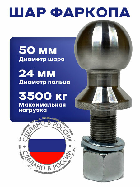 Шар для фаркопа 50мм является незаменимым элементом прицепного замкового устройства прицепа, обеспечивающим надежное соединение легкового авто или внедорожника с различными прицепами. Шар для прицепного устройства/шар на прицепное устройство подходит как под стандартные прицепы легковых автомобилей, так и под прицеп для квадроцикла, снегохода и других транспортных средств, он фиксирует замок прицепного устройства. Основным преимуществом фаркоп шара является его съемный дизайн, что упрощает установку/насадку и демонтаж в зависимости от потребностей пользователя. Универсальный механизм крепления прицепного устройства обеспечивает совместимость с автомобилями любых моделей, включая популярные марки внедорожников, таких как уаз, патриот и т. д. При этом палец для фаркопа способен выдерживать предельную тяговую нагрузку до 3500 кг, что делает шар для фаркопа съемный подходящим выбором для буксировки тяжелых грузов, легких прицепов и трейлеров автомобилем. Конструкция шара фаркопа 50мм включает металлическую головку, которая гарантирует прочность и долговечность использования. В комплект входят все необходимые болты и элементы для быстрого монтажа, поэтому в сборе и установке не займет много времени. Характеристики: - диаметр шара фаркопа - 50 мм; - диаметр резьбы ножки стержня-24 мм; -длина ножки - 41 мм; - предельная тяговая нагрузка-3500 кг; - производитель- Сервис-Штамп, Россия
