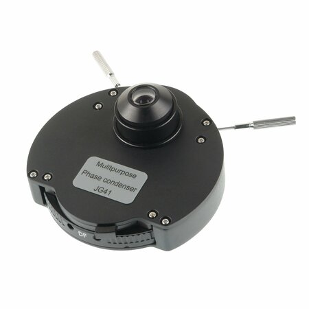 Фазово-контрастное устройство (Микромед 3 U) – устройство для наблюдения методом фазового контраста ФКУ, предназначается для исследования малоконтрастных объектов, не видимых в микроскопы при обычных условиях наблюдения. Устройство может применяться совместно с биологическими микроскопами Микромед 3 (U2) и Микромед 3 (U3). Основными частями устройства являются фазовый конденсор, фазовые объективы и вспомогательный микроскоп. Крепление фазового конденсора типа ласточкин хвост. В комплект входят фазовые объективы-планахроматы 10х/0,25; 20х/0,40; 40х/0,65; 100х/1,25. Объективы рассчитаны на длину тубуса бесконечность и толщину покровного стекла 0,17 мм Принцип действия устройства основан на методе фазового контраста, позволяющем наблюдать неокрашенные малоконтрастные препараты. Конденсор может быть использован для наблюдения обычным способом; для этого под револьверным диском имеется ирисовая диафрагма, а в диске револьвера, кроме кольцевых диафрагм, имеется свободное отверстие для пропускания всего пучка света. Смена кольцевых диафрагм, в зависимости от применяемого объектива, производится поворотом револьверного диска за накатанную часть до фиксации, причем в окне кожуха конденсора должна появиться цифра, соответствующая увеличению применяемого объектива или цифра «0», соответствующая свободному отверстию. Вспомогательный микроскоп применяется при центрировке изображения кольцевой диафрагмы конденсора относительно фазового кольца объектива. Слайдер-конденсор темного поля приобретается дополнительно. Комплектация Фазовый конденсор – 1 шт. Объективы – 4 шт. Вспомогательный микроскоп – 1 шт. Руководство по эксплуатации Гарантийный талон