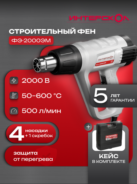 Пригоден для использования в профессиональных целях: Цифровая регулировка внутри каждого режима работы с шагом 10 градусов; Нагреватель повышенной надежности на керамике Защита от перегрева Два режима работы: От 50 до 600 градусов, поток 300 л/мин От 50 до 600 градусов, поток 500 л/мин Режим продувки, активирующийся автоматически после выключения; Удобная форма, для установки фена вверх соплом; Набор из 4х насадок и скребок в комплекте; Удобный транспортировочный кейс. Спецификация: Параметры сети питания, В/Гц: 220/50 Номинальная потребляемая мощность, Вт: 2000 Температура нагрева °С: 50-600 Производительность, л /мин: 300, 500 Длина шнура питания с вилкой, м, не менее : 2 Класс безопасности машины (по ГОСТ Р МЭК 60745-1) : II Комплектация: Фен электрический ФЭ-2000ЭМ 1 шт. Руководство по эксплуатации и Инструкция по безопасности 1 шт. Цикля (скребок) 1 шт. Рукоятка 1 шт. Насадка редукционная 1 шт. Насадка плоская 1 шт. Насадка «паяльное зеркало» 1 шт. Насадка направляющая 1 шт. Кейс пластиковый 1 шт.