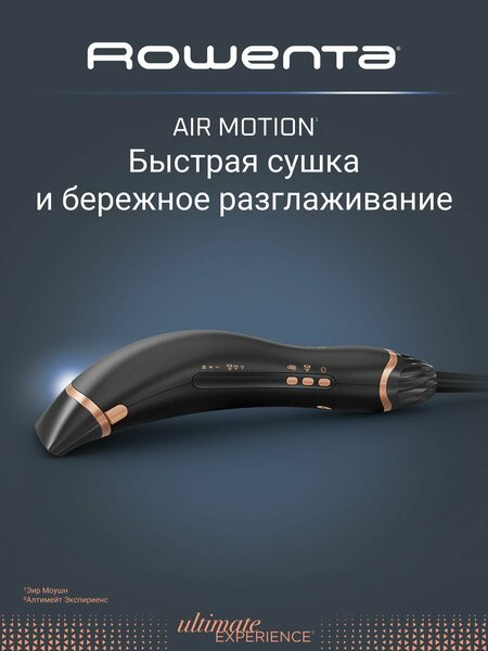 Премиальный фен Ultimate Experience Air Motion от Rowenta – совершенные технологии и профессиональный подход к укладке волос. Мощный мотор и тонкий концентратор 5 мм создают направленный поток воздуха для идеальной укладки без усилий. Стильный и ультра легкий корпус делает сушку волос невероятно комфортной. Перейдите на новый уровень с Ultimate Experience Air Motion. Полностью управляйте процессом сушки - фен позволяет выбрать любую из 9 комбинаций скорости и температуры воздушного потока, а также позволяет надежно фиксировать укладку с помощью обдува холодным воздухом. Ионизация снижает статическое электричество, делая волосы мягкими, послушными и блестящими. Съемная решетка позволяет легко очищать прибор и продлевать его срок службы. В комплекте с феном идет тонкий концентратор 5 мм, насадка гребень и стильный чехол.