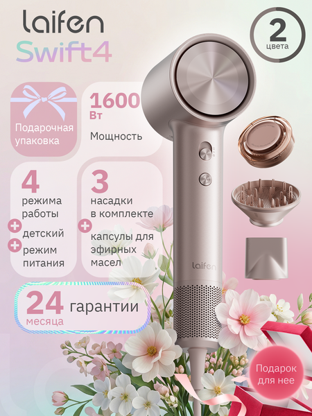 Laifen Swift 4 — фен нового поколения с интеллектуальным уходом и скоростью 115000 об/мин Laifen представляет новый уровень домашнего ухода за волосами — фен Swift 4, сочетающий в себе мощность, инновации и настоящий салонный эффект. Благодаря новому бесщёточному мотору, работающему на скорости до 115000 оборотов в минуту, устройство обеспечивает молниеносную сушку без перегрева и повреждений структуры волос. Одной из главных инноваций стал встроенный режим увлажнения: в комплект входят сменные капсулы с эфирными маслами для разных типов волос. Фен автоматически распыляет ухаживающие компоненты в процессе сушки — больше не нужно наносить уход отдельно. Это решение значительно экономит время и делает процесс не только удобным, но и эффективным. Дополнительную защиту обеспечивает интеллектуальный контроль температуры, который проверяет нагрев до 1000 раз в секунду, стабилизируя поток и предотвращая перегрев. Laifen Swift 4 поддерживает управление через мобильное приложение, где доступны уникальные режимы: детский, уход за чувствительными волосами, а также автоматическая смена температуры с чередованием тёплого и холодного обдува. Это делает фен универсальным — он подойдёт для всей семьи и разных сценариев использования. Несмотря на высокую производительность, устройство остаётся тихим — уровень шума не превышает 59дБ. Лёгкий корпус, магнитные насадки и длинный шнур обеспечивают комфорт в повседневном использовании. Swift 4 — это не просто фен, а продвинутый инструмент для заботы о волосах, созданный с вниманием к деталям и современным требованиям.