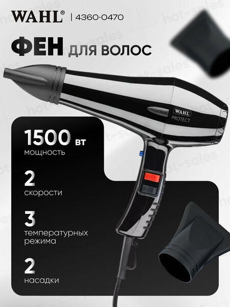 Профессиональный фен для волос Wahl Protect разработан специально для тех, кто беспокоится о своих волосах. Фен идеально подходит для использования в домашних условиях, а так же для салонов красоты и парикмахерских, работа в которых не требует спешки и быстрой сушки. Фен имеет мощность 1500 Вт и обладает производительным двигателем переменного тока, благодаря чему модель имеет хороший воздушный поток и умеренную температурную мощность. Главная идея модели – это сбалансированная мощность и производительность, которая может быть использована в профессиональных целях, защищая волосы от чрезмерного температурного воздействия на них. Профессиональные модели фенов весьма популярны среди бытовых пользователей, но к сожалению многие просто травмируют волосы из-за неумения обращаться с профессиональным устройством. Поэтому приобретение модели Protect позволит получить хорошие результаты и уберечь волосы. Профессиональный фен для волос Wahl Protect разработан специально для тех, кто заботиться Особенности модели Wahl Protect, 1500W 4360-0470: Профессиональный фен с надежным двигателем переменного тока с длительным сроком службы; Мощностью до 1500 Вт – экономичный с чрезвычайно высоким расходом воздуха 28,1 л/сек. – Система потока воздуха; очень быстрое высыхание; Эргономичная форма с удобной ручкой для приятной работы; 2 ступени скорости, 2 ступени температуры; 1 шаг холодного воздуха; кнопка охлаждения для быстрого охлаждения горячего воздуха; Предохранительный термостат предотвращает перегрев и повреждение фена; Легкий – 570 г; Кабель 3 мс с петлей для подвески.
