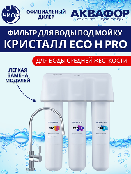 Фильтр для воды Аквафор Кристалл Эко Н Pro - это система глубокой очистки и умягчения с абсолютной антибактериальной защитой. Комбинация трех сменных модулей Pro 1, Pro H и Pro B обеспечивает четырехступенчатую фильтрацию водопроводной воды. Сразу несколько инноваций позволили увеличить ресурс глубокой очистки картриджей Кристалл Eco H Pro 8000 литров. Модули этой комбинации уменьшают образование накипи в воде средней жесткости (не выше 5 мгэкв/литр) и обеспечивают абсолютную защиту от бактерий и цист без химических бактерицидов благодаря модулю Pro B с микрофильтрационной мембраной. Ультрафильтрация надежно защищает от бактерий без химических бактерицидов, вода безопасна без кипячения для детей и людей страдающих аллергиями. Фильтр ECO Н Pro сохраняет минеральный состав исходной воды и обеспечивает абсолютную защиту от бактерий и микроорганизмов без химических бактерицидов. Обязательно соблюдайте правильный порядок установки картриджей! От этого зависит качество очистки воды.