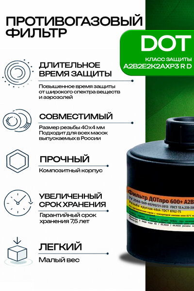 Фильтр противогазовый ДОТ про 600+ марки А2В2Е2К2АХР3RD - 1 штука.