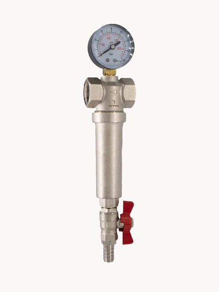 Фильтр самоочищающийся 1/2" с манометром СТМ термо применяется для очистки транспортируемой среды от нерастворимых механических примесей. На пути следования поток должен пройти через фильтроэлемент 100 мкм объединенных в один фильтр (картридж). На выходе получается очищенный поток. Примесь задержанная фильтром оседает на дне. Фильтр снабжен дренажным краном. При открытии дренажного крана — грязь под давлением системы вымывается наружу и фильтр очищается. Фильтр способствует продлению срока службы запорных элементов, бытовых и сантехнических приборов. Манометр показывает давление в системе. Корпус фильтра изготовлен из латуни ЛС-58-3. Фильтрующий картридж изготовлен из пластика ABS. Сетка фильтрующего картриджа изготовлена из нержавеющей стали. Дренажный (спускной) кран изготовлен из латуни ЛС-58-3. Резьба под манометр - 1/4 дюйма Размер присоединения дренажного (спускного) крана - 1/2 дюйма Диапазон измерения манометра - 1.10 бар Рабочее давление - 16 бар Максимальная температура рабочей среды +90°C