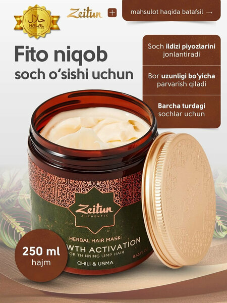 Фито-маска ZEITUN для роста волос стимулирует естественный рост и укрепляет волосяные луковицы.;Разогревающий экстракт красного перца усиливает микроциркуляцию и пробуждает спящие фолликулы.;Натуральные масла лавра, мяты и лемонграсса питают кожу головы и улучшают структуру волос.;Маска для укрепления волос помогает восстановить плотность и придать блеск по всей длине.;Средство против выпадения волос снижает ломкость и делает волосы заметно гуще.;Формула без силиконов, парабенов и SLS подходит для регулярного ухода за ослабленными волосами.;Маска с натуральными компонентами обеспечивает питание, восстановление и мягкость волос.;Приятный разогревающий эффект делает уход комфортным и усиливает действие активных веществ.;Подходит для всех типов волос и особенно эффективна при ослабленных и тонких прядях.;Маска ZEITUN для роста волос обеспечивает профессиональный уход в домашних условиях.
