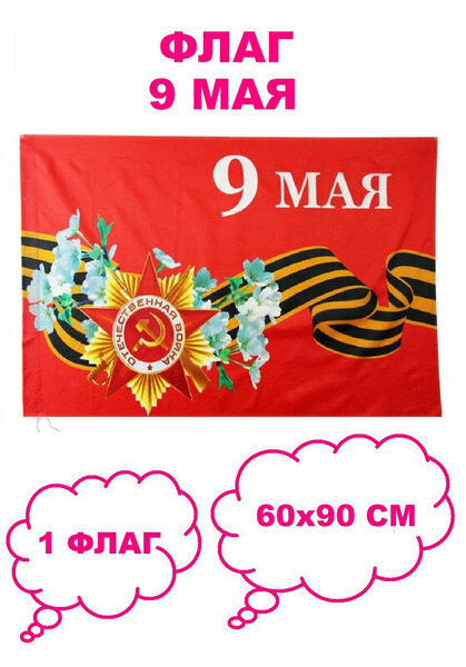 Флаг 9 мая! 60х90 см 1 штука. Такой флаг - традиционный в день Победы 9 мая атрибут, который позволяет его обладателю выразить свою гражданскую позицию к памяти тех, кто сражался за независимость нашей родины в годы войны, причастность к миллионам людей, чьи отцы и деды защищали нашу страну. Этот флаг станет отличным подарком для всех, кто уважает и помнит подвиги наших предков и также отлично дополнит ваш праздничный костюм или форму на 9 мая, а также поможет выделиться в толпе. Флаг имеет большой размер 60х90 см и выполнен из качественных синтетических материалов (полиэстер), что гарантирует его долговечность и яркость цветов. Яркий принт главных символов дня победы георгиевской лентой и орденом Победы. Флаг может стать отличным дополнением к вашей коллекции сувенирной продукции, может использоваться как украшение флаг для автомобиля. Флаги, знаменующие великий день победы - это символ нашей победы в Великой Отечественной войне. Флаг является главным символом этого дня и необходим для каждого праздничного мероприятия. Почувствуйте себя частью великой победы! В полотнище флага имеется карман шириной 4,5 см в сложенном виде (карман входит в размер флага) для вставки флагштока (древка), с закрепляющими тесемками внизу. Флаг продается без флагштока. Идеально подойдет как для использования на открытом воздухе, так и для закрытых помещений. Гладить флаг необходимо только в бережном режиме. Цвет: красный. Комплектация: 1 флаг.
