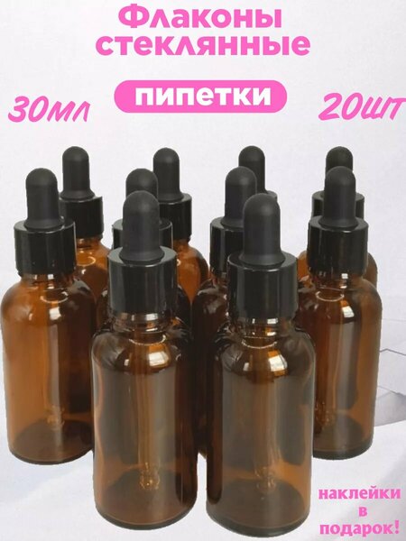 Косметический стеклянный флакон с пипеткой объемом 30 мл. из полупрозрачного темного стекла. Это один из самых популярных объемов для косметических флаконов. Бутылочка идеально подойдет для хранения масел, сывороток и других жидких косметических и фармацевтических средств. Удобная стеклянная пипетка с резиновой грушей помогает аккуратно дозировать использование жидкости, а темный цвет стекла обеспечивает защиту от света. Вы можете выбрать комплект от 1 до 20 штук. Упаковка в картон и пупырчатую пленку обеспечат сохранность при доставке как для самих флаконов, так и для стеклянной пипетки. Бутылочка имеет стандартную горловину 18/410 и может быть использована с другими крышками. Вместе с пустым флаконом вы получите наклейку белого цвета и сможете подписать, какое средство вы храните в каждой бутылочке
