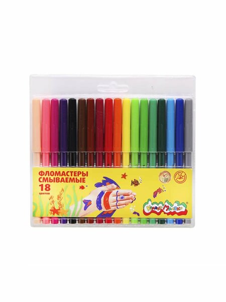 Фломастеры – это популярный предмет канцелярии, который обожают школьники, малыши и подростки. Они идеально подходят для рисования и творчества, ведь с их помощью можно воплотить любые задумки и фантазии на бумаге. Набор фломастеров включает множество ярких и насыщенных цветов, что помогает создавать удивительные рисунки. Удобную упаковку легко транспортировать и хранить. Каждый маркер имеет уникальный колпачок, предотвращающий высыхание и обеспечивающий безопасность при использовании, защищая дыхательные пути от случайного проглатывания. Корпус выполнен из прочного материала, который удобно держать в руках благодаря специальной зоне захвата. Толщина линии варьируется в зависимости от давления и угла наклона, что способствует достижению разнообразных художественных эффектов. Эти маркеры безопасны для детей, поскольку чернила легко смываются с одежды и рук, не оставляя следов. Персонажи на упаковке часто привлекают внимание малышей, делая процесс рисования еще более увлекательным. Таким образом, этот набор является идеальным инструментом для развития творческих способностей и художественных навыков у ребят всех возрастов. Фломастеры, 18 цветов, корпус круглый, конический, смываемые, колпачок вентилируемый, Каляка-Маляка, ФКМ18. упаковка блистер; корпус круглый; количество цветов 18 цветов; наконечник конический; колпачок вентилируемый; европодвес да; смываемые да; Торговая марка: Каляка-Маляка; Страна: Китай; Упаковка: 12/144.