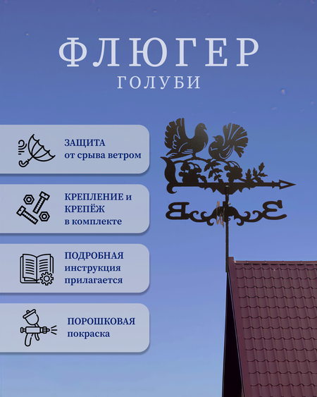 Флюгер "Голуби"сразу же приковывает взгляды своим уникальным дизайном. Изготовлен из высококачественных материалов, он прослужит вам долгие годы, не теряя своего первоначального вида. Каждая деталь продумана до мелочей, чтобы создать гармонию между функциональностью и эстетикой. Он является идеальным дополнением к любому стилю крыши, монтаж на любой тип кровли. Придаст ей индивидуальность и шарм. Защита от срыва ветром и гарантия 5 лет.
