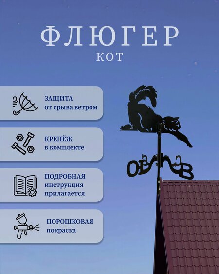 Флюгер "Кот" размер картинки 300*330, общий размер 620*300, в комплект поставки входит: Флюгер, ось вращения, кронштейн крепления на крышу, инструкция, указатели сторон света(С-Ю, З-В), смазка, соединительный крепёж указателей сторон света. Материл: металл 1,5 мм. Порошковая окраска, цвет- чёрная шагрень. Отличный подарок на любой праздник!