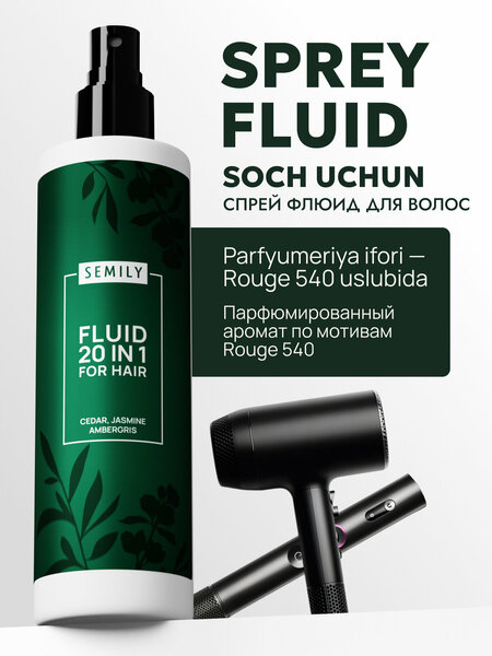Флюид для волос SEMILY термозащита 20 в 1 200 мл- Парфюмированный флюид для волос 20 в 1 обеспечивает лёгкое расчесывание, стойкую термозащиту и здоровый блеск локонов. Спрей значительно упрощает стайлинг и способен заменить утюжок и плойку для укладки: средство обладает разглаживающим эффектом и перевоплощает волосы в жидкий шелк. Насыщенная формула с натуральными маслами и кератином избавляет от пушистости и запускает восстановление структуры волос, действуя против секущихся кончиков и ломкости. Аргановое масло стимулирует увлажнение и питание прядей от корней до кончиков, помогает от сухости и тусклости локонов. Восстанавливающий флюид - реконструктор идеален для пористых и истонченных волос: профессиональный уход оздоравливает волосы и придает им эффектный вид как после салона. Несмывашка гарантирует надежную термо защиту до 250 градусов, антистатик - эффект и предотвращает негативное воздействие УФ-лучей. Легкая текстура флюида представляет собой жидкость с парфюмированным ароматом, которая невесомо ложится на волосы без утяжеления и липкости. Несмываемый элексир подходит всем типам волос: для вьющихся, кудрявых, прямых, окрашенных и т. д. Разработан по стандартам Кореи. Флюид для волос SEMILY термозащита с ароматом вишни 200 мл -Парфюмированный флюид для волос 20 в 1 обеспечивает лёгкое расчесывание, стойкую термозащиту и здоровый блеск локонов. Спрей значительно упрощает стайлинг и способен заменить утюжок и плойку для укладки: средство обладает разглаживающим эффектом и перевоплощает волосы в жидкий шелк. Насыщенная формула с натуральными маслами и кератином избавляет от пушистости и запускает восстановление структуры волос, действуя против секущихся кончиков и ломкости. Аргановое масло стимулирует увлажнение и питание прядей от корней до кончиков, помогает от сухости и тусклости локонов. Восстанавливающий флюид - реконструктор идеален для пористых и истонченных волос: профессиональный уход оздоравливает волосы и придает им эффектный вид как после салона. Несмывашка гарантирует надежную термо защиту до 250 градусов, антистатик - эффект и предотвращает негативное воздействие УФ-лучей. Легкая текстура флюида представляет собой жидкость с парфюмированным ароматом, которая невесомо ложится на волосы без утяжеления и липкости. Несмываемый элексир подходит всем типам волос: для вьющихся, кудрявых, прямых, окрашенных и т. д. Разработан по стандартам Кореи.
