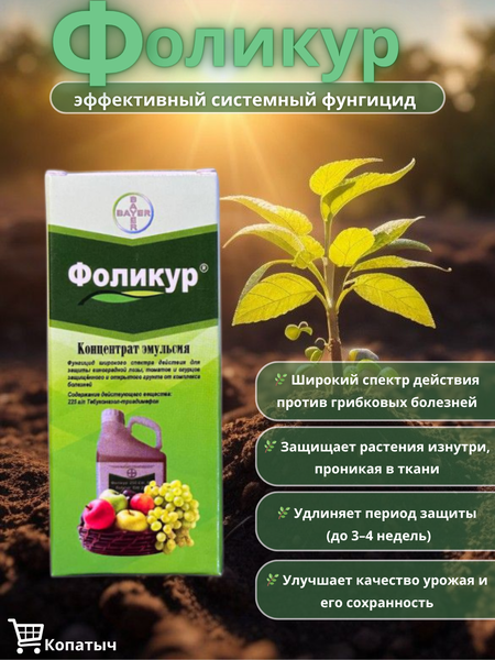 Состав Инструкция Широкий спектр действия: Эффективен против множества грибковых заболеваний. Длительная защита: Предотвращает повторное заражение на срок до 3–4 недель. Быстрое действие: Начинает работать уже через несколько часов после обработки Удобство применения: Легко растворяется в воде и равномерно распределяется по растениям. Безопасность: При правильном использовании безопасен для растений и окружающей среды. "Фоликур" – ваш помощник в борьбе за урожай! "Фоликур" – эффективный фунгицид для защиты растений от болезней!"Фоликур" – это высокоэффективный фунгицид в форме концентрата эмульсии, предназначенный для борьбы с грибковыми заболеваниями растений. Он обеспечивает надежную защиту от таких болезней, как мучнистая роса, ржавчина, септориоз и других. Препарат подходит для обработки зерновых, овощных, плодовых и декоративных культур. Он быстро проникает в ткани растений, обеспечивая длительную защиту и предотвращая повторное заражение. Меры предосторожности: Используйте перчатки, защитные очки и маску при работе с препаратом. Храните в недоступном для детей и животных месте. Не применяйте во время цветения растений, чтобы не навредить пчелам. Быстрое и эффективное уничтожение болезней растений!