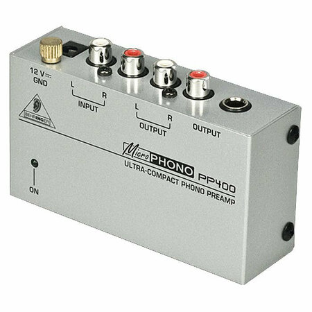 Behringer PP 400 MICROPHONO - предусилитель-корректор для проигрывателей виниловых дисков преобразует сигнал с проигрывателя в сигнал линейного уровня. Вход на разъемах RCA, выходы на разъёмах RCA и 1/4 TRS Jack.