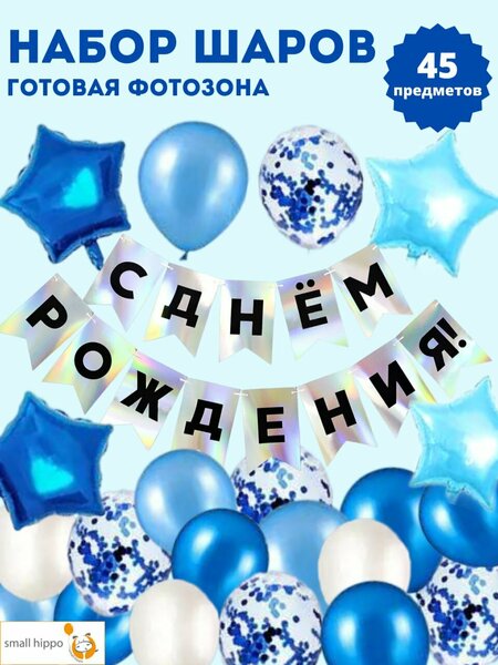 Фольгированный шар звезда синий - 2 шт, фольгированный шар звезда голубой - 2 шт, шар синий 30 см - 8 шт, шар белый 30 см - 6 шт, шар конфетти 30 см - 6 шт, шар голубой 30 см - 14 шт, растяжка голография "С Днем Рождения", декоративная лента - 2 шт, трубочка - 1 шт, клеевые точки