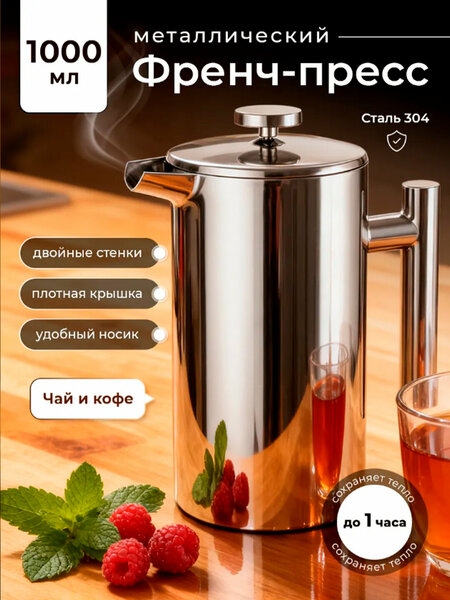 Френч-пресс из нержавеющей стали — стильный и надёжный аксессуар для приготовления ароматного кофе и чая. Корпус полностью выполнен из стали, что обеспечивает долговечность, устойчивость к температуре и лёгкость ухода. Ручка с защитой от брызг делает использование комфортным и безопасным. Подходит для дома, офиса, путешествий, а также станет отличным подарком кофеману. Преимущества: Полностью из нержавеющей стали Объём 800 мл — оптимально для 3–5 чашек Удобная ручка с защитой от нагрева и брызг Прочный, легко моется, не впитывает запахи Для кофе, чая, травяных настоев и латте-напитков
