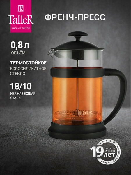 Френч-пресс TalleR TR-2317 800 мл Элфи Колба выполнена из боросиликатного стекла, устойчивого к перепадам температур. Корпус выполнен из безопасного пищевого пластика (РР). Пресс выполнен из высококачественной нержавеющей стали. Оптимальный размер ячеек фильтра обеспечивает идеальную фильтрацию напитка. Утолщенный ободок колбы повышает прочность и продлевает срок службы изделия. Форма края носика препятствует образованию подтеков. Удобная ненагревающаяся бакелитовая ручка. Благодаря теплоизоляционным свойствам устойчивое основание защищает поверхность от повреждений. В комплекте мерная ложка и буклет с рецептами. Пригоден для мойки в посудомоечной машин.