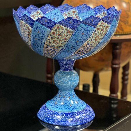 Фруктовница "Минакари" - это уникальное изделие, выполненное в древней технике иранской расписной эмали - Минакари. Родина этой техники - древняя столица Ирана, город Исфахан. Фруктовница изготовлена из меди, что обеспечивает ей прочность и долговечность. Эмаль, покрывающая основу, придает изделию неповторимый и яркий вид. Рисунок в технике Минакари никогда не повторяется и является ручной работой персидских мастеров. Обычно он выполняется в синем, голубом или лазурном цвете, что придает фруктовнице особый шарм и изысканность. Фруктовница имеет размеры 27*28 см и весит 1000 грамм. Это делает ее удобной для хранения и использования. Фруктовница "Минакари" станет отличным дополнением к интерьеру вашего дома или офиса. Она может стать прекрасным подарком для женщины, мужчины, руководителя или просто для близкого человека. Фруктовница "Минакари" - это не просто предмет интерьера, это произведение искусства, созданное руками персидских мастеров. Она станет ярким акцентом в вашем доме и принесет радость и удовольствие от использования.