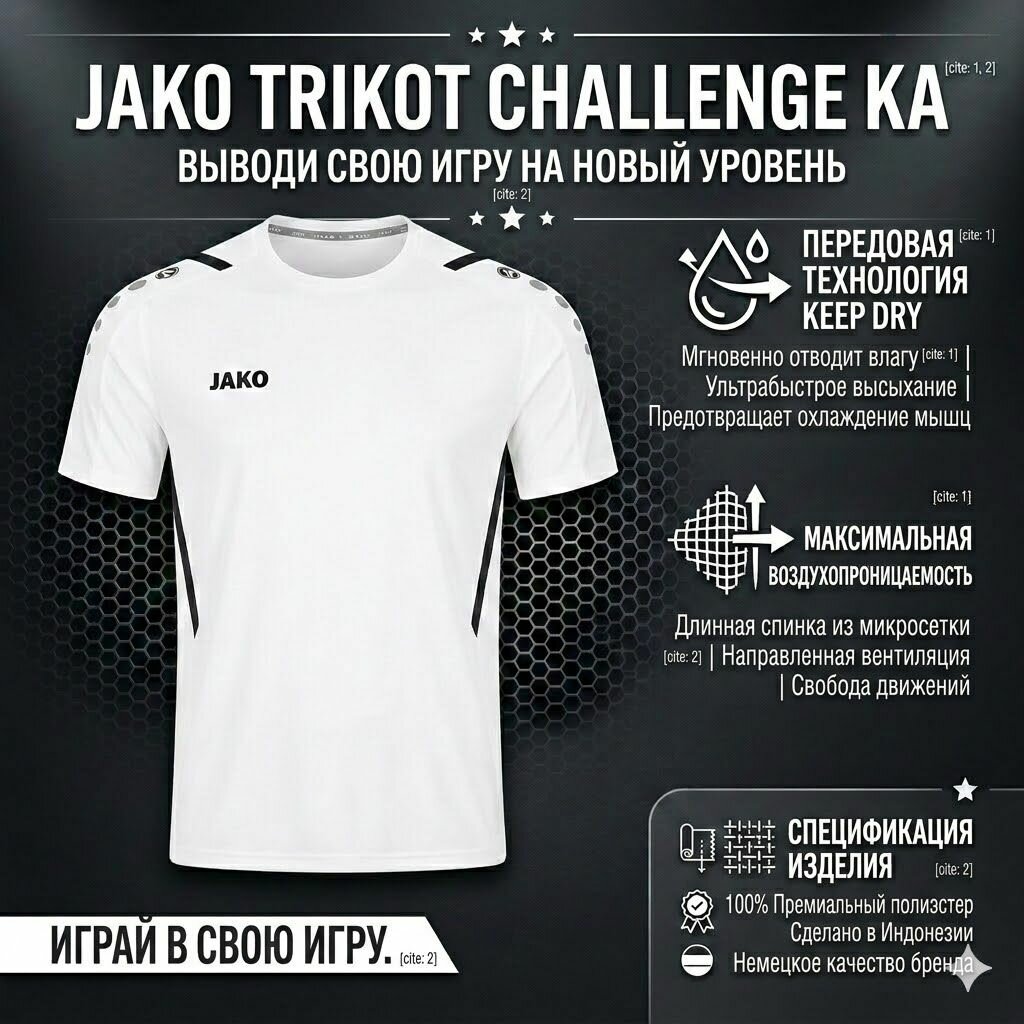 Спортивная футболка / Футбольная джерси JAKO Trikot Challenge KA Описание: Выходите на новый уровень игры! Профессиональная спортивная футболка Trikot Challenge KA от премиального немецкого бренда JAKO — это ваш надежный партнер на футбольном поле, в спортзале или на пробежке. Инновации для ваших побед (Технология KEEP DRY) Эта модель создана для высоких нагрузок. Благодаря передовой технологии KEEP DRY, микроскопические волокна ткани работают как насос: они мгновенно отводят влагу от тела на поверхность материала, где она моментально испаряется.