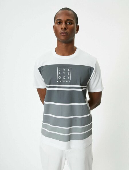 Футболка с круглыми вырезами и короткими рукавами идеально подходит для повседневного стиля. Надпись и полосатый принт добавляют оригинальности во внешний вид, делая её подходящей для разных случаев. Хлопковый материал обеспечивает комфорт и мягкость на протяжении всего дня. Характеристики продукта Тип выреза: Круглый Тип рукава: Короткий Особенность: С надписью Материал: Хлопок Стиль: Повседневный