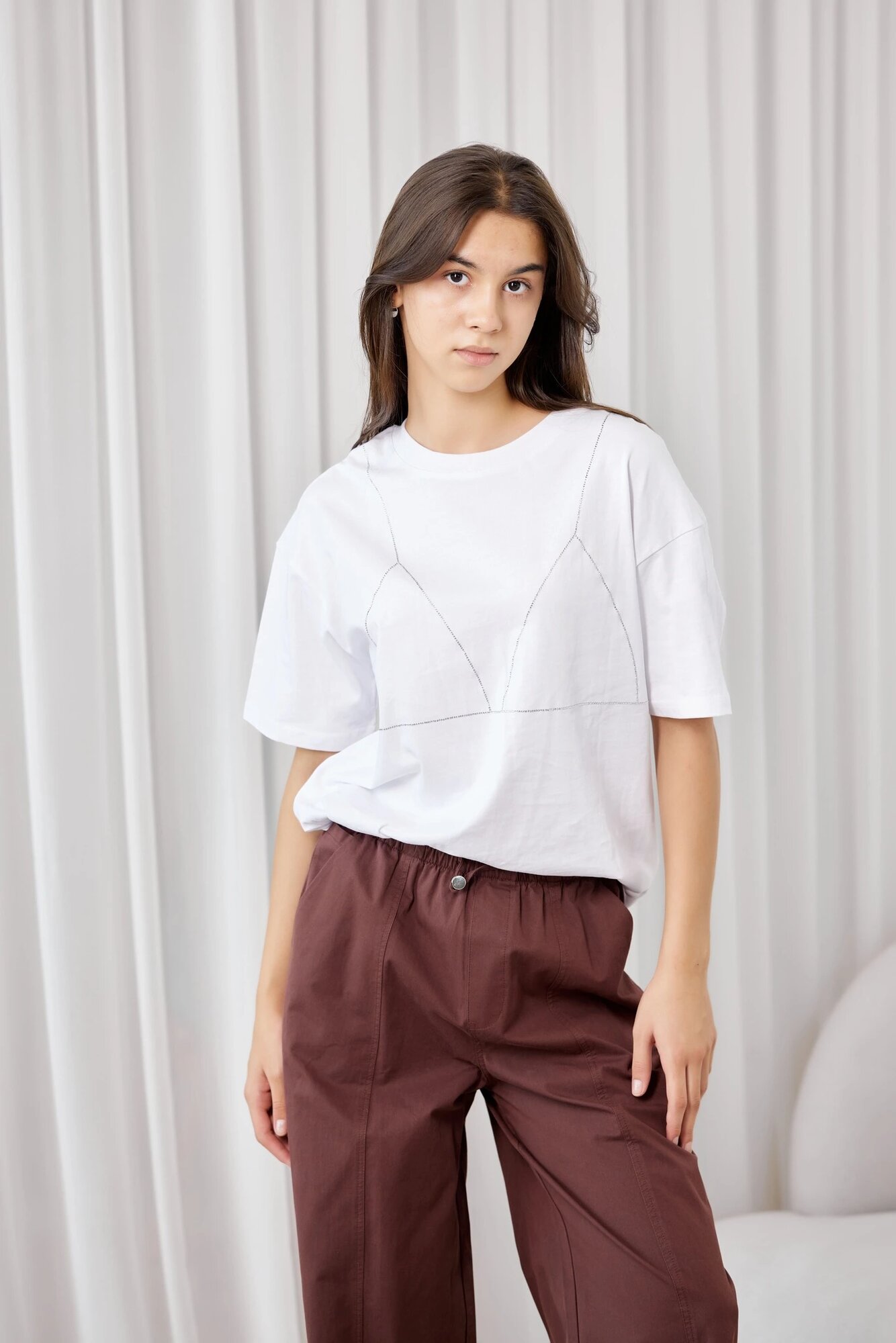Базовая футболка свободного кроя, декорированная стразами в форме бра. Имеет круглый воротник и комфортные короткие рукава. Отличный элемент любого повседневного гардероба.