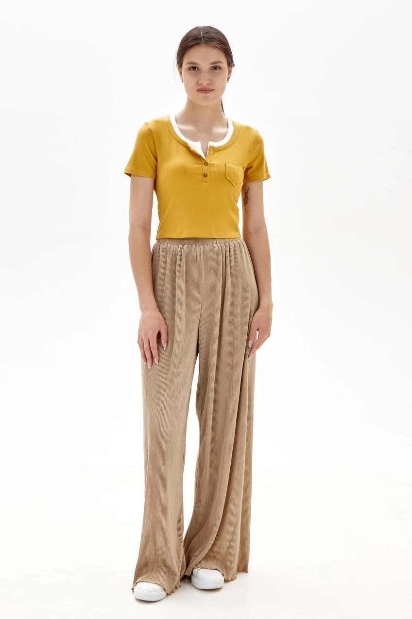 Стильная укороченная футболка с акцентным воротником и декоративными пуговицами. Имеет универсальный дизайн с комфортной посадкой, поэтому станет отличным вариантом для легкого повседневного образа.
