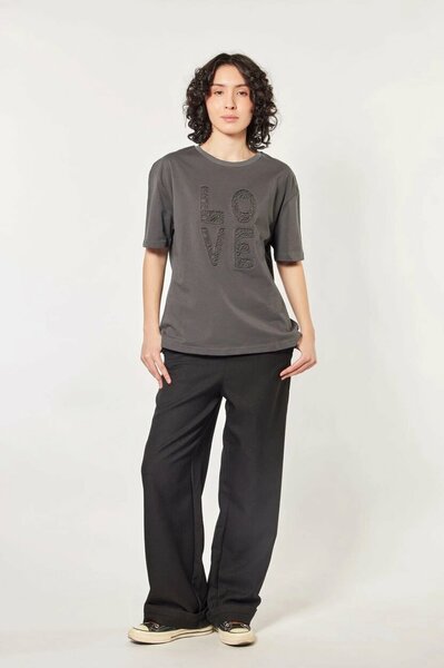 Базовая футболка свободного кроя с ажурной текстовой вставкой. Имеет круглый воротник и комфортные короткие рукава. Отличный элемент любого повседневного гардероба.