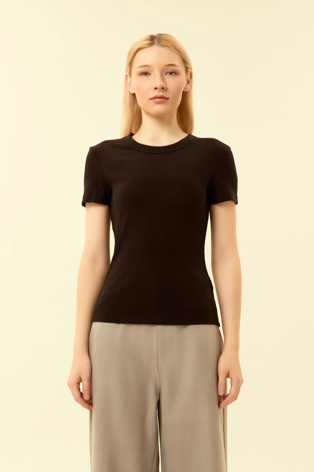 Футболка из мягкого эластичного трикотажа отличается лаконичным дизайном и идеальной посадкой по фигуре. Классический круглый вырез и короткие рукава делают её универсальной для повседневного гардероба. Материал хорошо тянется, обеспечивая комфорт при движении, и сохраняет форму даже после многократных стирок. Благодаря тонкой фактуре ткань приятно ощущается на теле и не вызывает дискомфорта. Простота силуэта позволяет легко комбинировать футболку с джинсами, брюками или юбками, создавая разные образы — от расслабленного до более строгого.