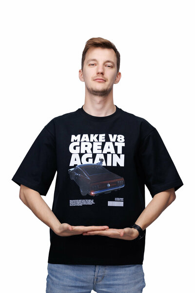 А нам сладкое рычание V8 дороже необоснованных криков экоактивистов. Мы перед сном пересматриваем документалку Стаса Асафьева про экологию и засыпаем с фразой на устах: Make V8 Great Again. Посвящаем вас в ряды фанатов звука двигателя и одеваем в специальную униформу этого движения. Черная футболка из 100% хлопка с качественной печатью на груди. Девушка возле Форда Мустанга и наша новая мантра. Тираж крайне ограничен! Советуем не тормозить с покупкой так же, как V8 не сбавляет обороты в самый ответственный момент. И да. Кто такая Алиса? Стирка не выше 30 градусов и не более 1000 оборотов, барабанная сушка запрещена; гладить только с изнаночной стороны при температуре утюга не выше 80 градусов или ищи минимальный режим типа: "шелк"
