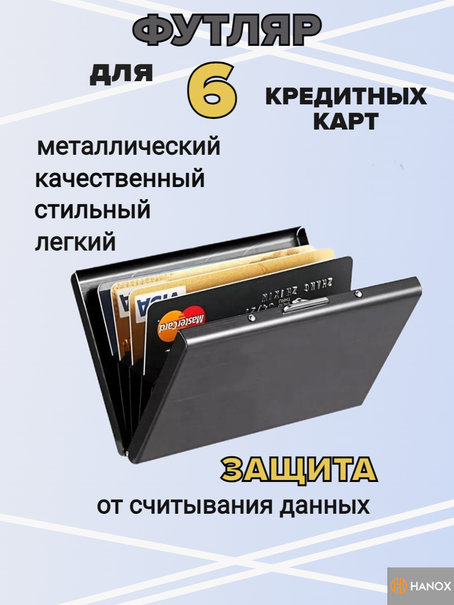 Стильный, ультратонкий держатель для кредитных карт с защитой от считывания данных с карты (RFID защита, NFC защита). Забудьте о тяжелых, громоздных кошельках! Удобный механизм для быстрого доступа к картам. Легкий и прочный держатель из алюминиевого сплава легко помещается в карман и не вызывает никаких неудобств. При своем минимальном размере держатель вмещает 6 пластиковых карт. Цветовая палитра позволит сделать выбор как для мужчин, так и для женщин.