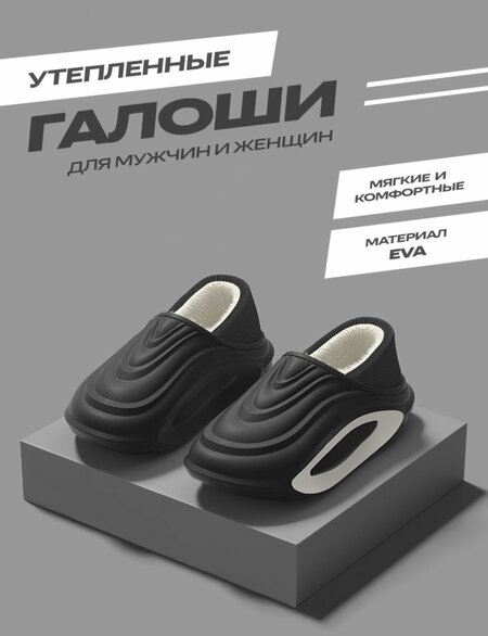 Галоши утепленные на толстой подошве – это надежная защита ваших ног от влаги и холода в прохладный период. Модель унисекс, благодаря своему спортивному стилю подходит как для мужчин, так и для женщин. Верх и подошва галош изготовлены из прочного и легкого материала ЭВА, что обеспечивает их долговечность и удобство в использовании. Данный материал так же делает их водонепроницаемыми и устойчивыми к воздействию влаги, а плюшевый утеплитель создает дополнительный комфорт и сохраняет тепло в прохладную погоду. Отличительной чертой галош является их толстая подошва, которая гарантирует мягкость, надежное сцепление с поверхностью и предотвращает скольжение. Мягкие утеплённые галоши – это практичная обувь, которую можно носить как дома, так и на прогулках, на даче или в саду. Выбирая данную модель, вы обеспечиваете себе комфорт, удобство и защиту от непогоды в демисезонный период.