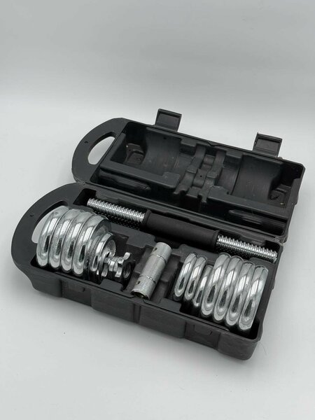 Представленный набор хромированных гантель включает: - 2 грифа диаметром 26 мм, длиной 34 см (длина резьбы 11 см с каждой стороны) и весом 1,35 кг; - 1 соединительный гриф; - 4 гайки, которые обеспечивают точные нагрузки давления; - хром пластины, диаметр отверстия 2,6 см, со следующей конфигурацией: - 4 диска х 0,5 кг (диаметр 9,5 см, ширина 1,4 см); - 8 дисков х 1,25 кг (диаметр 11 см, ширина 1,8 см); - 1 пара перчаток.