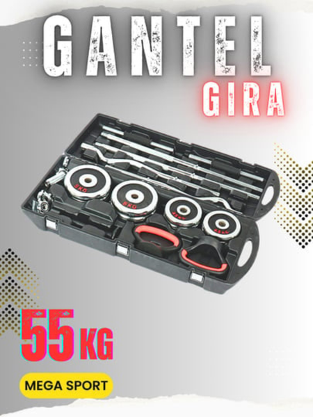 Название товара: Набор гантелей Gira 55 кг – Mega Sport Описание: Профессиональный набор гантелей и штанги Gira 55 кг от Mega Sport — идеальное решение для домашних тренировок. Подходит как для начинающих, так и для опытных спортсменов. Все элементы удобно упакованы в прочный кейс для хранения и транспортировки. Комплектация: Металлические диски с хромированным покрытием – общий вес 55 кг 2 коротких грифа (для гантелей) 1 длинный гриф (для штанги) 1 изогнутый гриф (EZ-гриф) Упоры/эспандеры для рук Прочный кейс с ручками Материал: Металл с хромированным покрытием, прорезиненные ручки Преимущества: Возможность использовать как гантели, так и штангу Подходит для набора массы, силовых и фитнес тренировок Удобное хранение и транспортировка Универсальный комплект для домашних и заловых тренировок Вес: 55 кг (весь набор) Бренд: Mega Sport Назначение: Для домашних тренировок, бодибилдинга, силовых упражнений, фитнеса