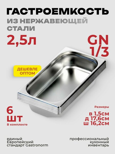 Гастроемкость GN 1/3 – идеальное решение для профессиональной кухни! Сделанная из высококачественной нержавеющей стали, она обеспечивает надежную защиту от коррозии и легко моется даже после интенсивного использования. Компактный формат позволяет равномерно распределить продукты или блюда, а комплект из 6 штук гарантирует достаточное количество вместительных контейнеров для любых задач. Подходит как для хранения, так и для приготовления — сочетает эргономику и практическую пользу. Легкая конструкция облегчает работу с емкостью, а аккуратные грани обеспечивают плотное соединение друг с другом. Выбирайте проверенный вариант для ресторанов, кафе и домашней кухни! Гастроемкость из нержавеющей стали 1/3 65 мм, размер 325х176х65 мм, объем 2,5 л.