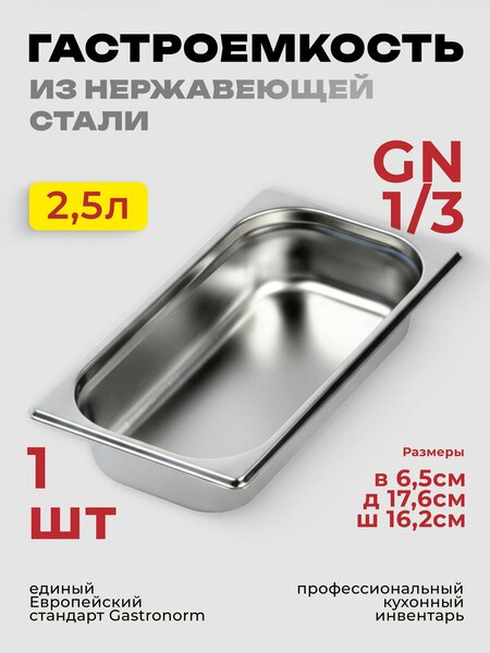 Гастроемкость GN 1/3 – идеальное решение для профессиональной кухни! Сделанная из высококачественной нержавеющей стали, она обеспечивает надежную защиту от коррозии и легко моется даже после интенсивного использования. Компактный формат позволяет равномерно распределить продукты или блюда. Подходит как для хранения, так и для приготовления — сочетает эргономику и практическую пользу. Легкая конструкция облегчает работу с емкостью, а аккуратные грани обеспечивают плотное соединение друг с другом. Выбирайте проверенный вариант для ресторанов, кафе и домашней кухни! Гастроемкость из нержавеющей стали 1/3 65 мм, размер 325х176х65 мм, объем 2,5 л.