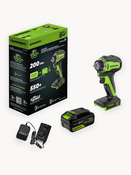 Гайковерт ударный акк. Greenworks G24IW200, 24V, б/щет, 3/8', 200Нм, 1х4Ач, ЗУ, кор (3803607CUB) Ударный гайковерт Greenworks G24IW200 – компактный инструмент для работ с резьбовым крепежом (гайки, болты) и метизами (винты, саморезы, шурупы) в мастерской или на строительной площадке. Разработан для быстрого заворачивания крепежа и метизов, без избыточного воздействия вращающего момента на руки пользователя. Прочный и эргономичный корпус инструмента из полимера со стекловолокном и нескользящим покрытием имеет длину всего 130 мм. Гайковерт построен на основе производительного бесщёточного двигателя DigiPro™, который эффективно использует энергию аккумулятора и не теряет мощность под нагрузкой. Работой инструмента управляет Greenworks Intelligent Power – инновационная цифровая система контроля и управления батареей, инструментом и зарядным устройством обеспечивающая максимальную производительность и долгий срок службы. Быстрая установка и смена торцевых головок осуществляется с помощью квадратного хвостовика 3/8” (9,5 мм) с фрикционным кольцом. Надёжный ударный механизм, тангенциального типа, установлен в металлический корпус редуктора, фронтальная и боковые части которого оснащены специальным покрытием для более комфортной работы. Яркая LED-подсветка рабочей зоны для комфортной работы в условиях слабой освещенности. Поясная клипса для практичной переноски на строительном объекте. Закрепляет 550+ метрических гаек М12х1,5 от заряда аккумуляторной батареи 4Ач. Технические данные: Платформа POWERALL 24V; Напряжение: 24V; Тип двигателя: бесщёточный DigiPro; Длина корпуса: 130 мм; Тип хвостовика: квадрат 3/8” (9,5 мм) с фрикционным кольцом; Тип удара: тангенциальный; Макс. крутящий момент (заворачивание): 200 Нм; Макс. крутящий момент (отворачивание): 280 Нм; Макс. число оборотов холостого хода: 2400 об/мин; Макс. частота ударов: 3200 уд/мин Число режимов работы: 1; Макс. размер метрического крепежа: М14; LED подсветка рабочей зоны; Плавная регулировка частоты вращения; Переставляемая поясная клипса; Масса без акб: 0,9 кг; Масса с акб 4Ач: 1,7 кг. Устройство совместимо со всеми АКБ платформы Greenworks POWERALL 24 V; Гарантия на устройство 3 года; Гарантия на АКБ 2 года. Комплектация: Гайковерт ударный Greenworks G24IW200; 1 хАКБ 4Ач; 1 х Зарядное устройство; Руководство по эксплуатации; Гарантийный талон; Картонная коробка.