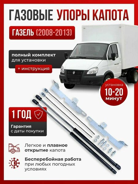 Данный комплект совместим: Газель (2003-нв), Газель бизнес (2003-нв), Соболь (2003-нв). Амортизаторы капота (стойки, держатели) - необходимые запчасти на легковые автомобили, автомобильные товары и аксессуары. Газлифты заменят кочергу и без усилий поднимут крышку капота. Слегка приоткройте ее и крышка сама поднимется до штатного угла открытия и надёжно зафиксируется. Никаких усилий при открытии, никакой грязной одежды, свободные руки! Опоры защитят вас от падения капота. При сильном порыве ветра капот может сорвать со стандартного крепления кочергой, что приведет к его самопроизвольному падению. При использовании упоров капота это исключено! Упоры капота - это ваш новый уровень комфорта, а главное - безопасности! Состав комплекта разработан для конкретного авто, с учетом всех конструктивных особенностей, что обеспечивает необходимую жесткость всей конструкции, исключает смещение и проворот кронштейнов. Надежные газлифты, оцинкованный крепеж (кронштейны толщиной 3мм, цинковое покрытие надежно защищает от коррозии) обеспечат долговечную работу в любых условиях. Упор не вносит конструктивных изменений, не влияет на гарантию диллера, не требует техобслуживания. Установка выполняется за 15-20 минут, без использования клепок, без сверления доп. отверстий, не нужны специальные навыки и доп. детали. Комплект содержит подробную инструкцию с фото и пошаговым описанием процесса установки. Если при установке возникнут сложности - обязательно обратитесь к специалистам нашей тех поддержки, мы оперативно подскажем, как их решить. Внимание! Перед установкой необходимо прокачать пневмоупоры - уперев шток в пол, полностью сжать и отпустить аммортизатор НЕ менее 5 раз. Отличный выбор для внешнего тюнинга Gazelle Business. Автотовары - упоры капота для автомобиля Газель.