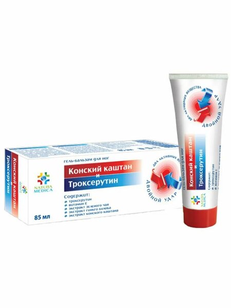 Гель-бальзам "Конский каштан и Троксерутин" от Natura Medica - это эффективное средство для ухода за ногами. Он снимает отечность, создает быстрый эффект свежести и снятия усталости. В составе геля-бальзама присутствуют такие активные ингредиенты, как экстракт конского каштана и троксерутин. Они укрепляют стенки сосудов, улучшают крово- и лимфообращение, способствуют восстановлению прочности и эластичности сосудов. Гель-бальзам рекомендуется как вспомогательное средство при лечении варикозного расширения вен, тромбофлебита, профилактике тромбозов, отеков и посттравматических поражений вен. Способ применения прост: нанесите гель-бальзам на чистую кожу в проблемных местах 2-3 раза в день снизу вверх до полного впитывания. Гель-бальзам не требует смывания, что делает его использование еще более удобным. Упаковка геля-бальзама представлена в виде тубы объемом 85 мл, что обеспечивает удобство использования и хранения продукта. Гель-бальзам "Конский каштан и Троксерутин" от Natura Medica - это надежное и эффективное средство для ухода за ногами, которое поможет вам поддерживать здоровье и красоту ваших ног.