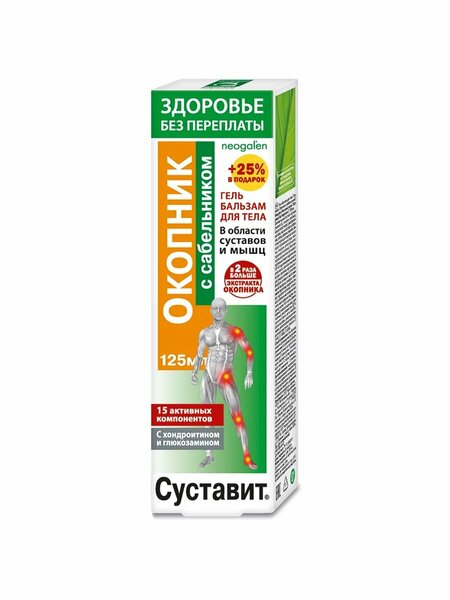 Гель-бальзам "Валентин Дикуль" для суставов с сабельником, 125 мл Гель-бальзам "Валентин Дикуль" с сабельником и окопником представляет собой эффективное средство на основе природных компонентов, предназначенное для ухода за суставами. Сабельник болотный оказывает биостимулирующее, антибактериальное, обезболивающее и противовоспалительное действие, способствует выведению солевых отложений и стимулирует восстановление хрящевой ткани. Окопник стимулирует регенерацию костной и хрящевой ткани при заболеваниях суставов, улучшает качество синовиальной жидкости и заживляет суставные микротравмы. Хондропротекторы обеспечивают питание и жизнеспособность суставов, тормозят деградацию и стимулируют восстановление хрящевых тканей. Девясил, зверобой и лопух являются мощными биогенными стимуляторами, ускоряющими восстановление и самовосстановление клеток хрящевых тканей. Гель-бальзам "Валентин Дикуль" с сабельником и окопником рекомендуется наносить круговыми массирующими движениями на проблемную область в течение 3-5 минут до полного впитывания 2-3 раза в день. По возможности обеспечьте суставу тепло и покой в течение 1-2 часов. Гель-бальзам "Валентин Дикуль" с сабельником и окопником не содержит искусственных красителей и подходит для всех типов кожи. Объем тюбика составляет 125 мл.