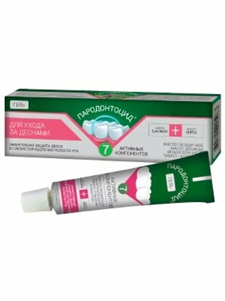 Пародонтоцид - гель для гигиены полости рта, разработанный для устранения разнообразных заболеваний десен и слизистой оболочки полости рта. Он уменьшает воспаление десен и слизистой оболочки полости рта. Способствует их защите в т.ч. после стоматологических вмешательств. Гель содержит компоненты, которые обладают антисептическими свойствами, способствуют заживлению слизистой оболочки рта и устранению неприятного запаха изо рта. Не содержит хлоргексидин и метронидазол. Пародонтоцид легко наносится. Перед применением необходимо вымыть руки. Выдавить из тюбика на палец около 1 см геля, нанести его на десну непосредственно или на марлевой полоске и оставить на 10-15 минут на деснах. Возможно легкое жжение! После нанесения геля не рекомендуется пить и принимать пищу в течение 30 минут. Применять курсами, не менее 2-х раз в день в течение 7-10 дней. Перед применением рекомендуется проконсультироваться с врачом.
