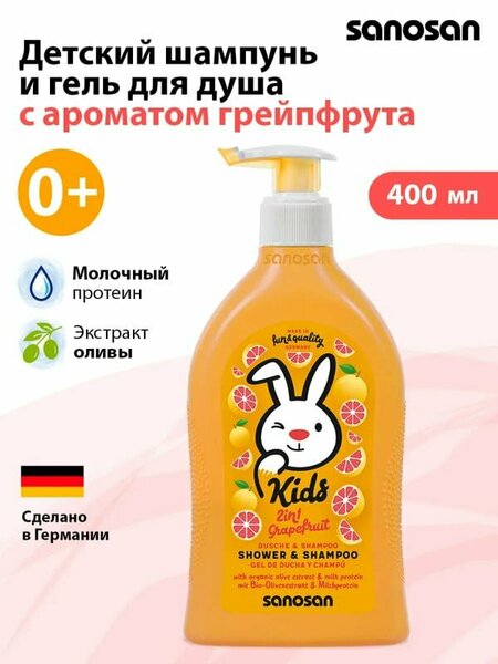 Sanosan Kids – гель-шампунь 2в1 с ароматом грейпфрута, 3+ (400 мл) — это заряд свежести и радости в каждом пузырьке. Яркий цитрусовый аромат превращает купание в игру, а мягкая формула заботится о коже и волосах.